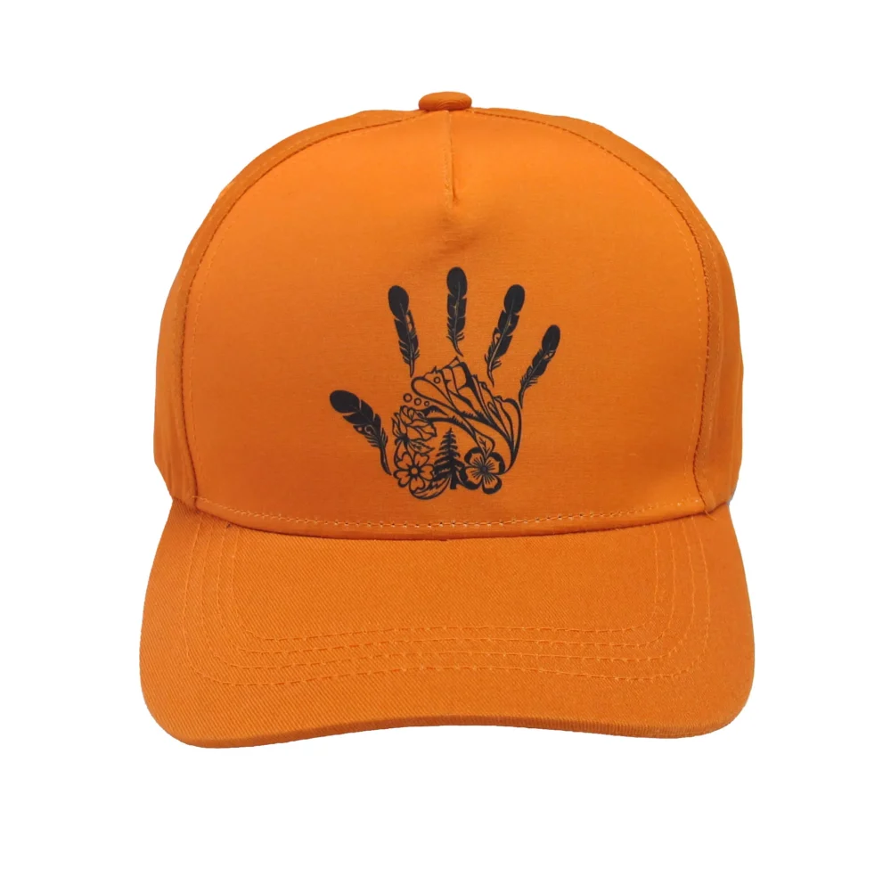 A deeply meaningful Indigenous art cap created to honour survivors and remember the children who never made it home. Designed by Gitxsan artist Michelle Stoney, the artwork features a symbolic hand — with Stigyoden, a sacred local mountain in the Gitxsan Nation, placed in the palm. Surrounding it are flowers known as majagalee (meaning children), while the feathers above represent the children being honoured and remembered. Adult size with adjustable band, made from 80% cotton / 20% polyester — a respectful wearable art piece for remembrance, reflection, and meaningful gifting.